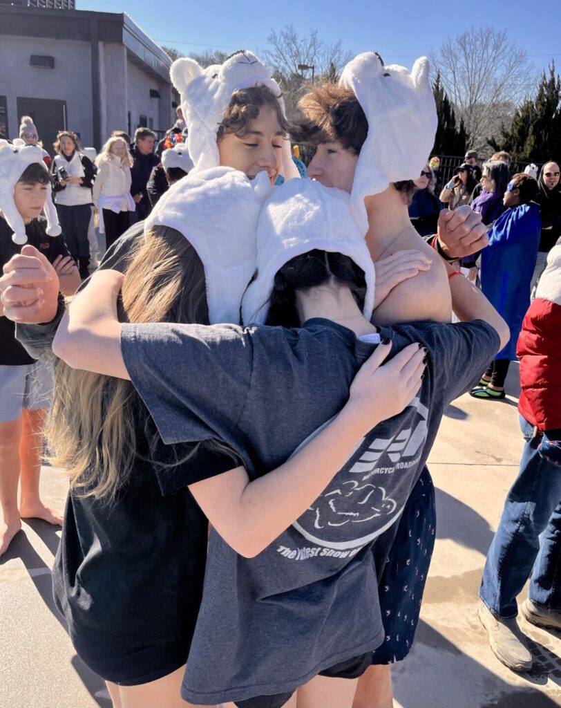 Before taking the plunge, they huddled together for a big group hug—and maybe a little pep talk. With hearts racing, they got ready to leap into the icy water.