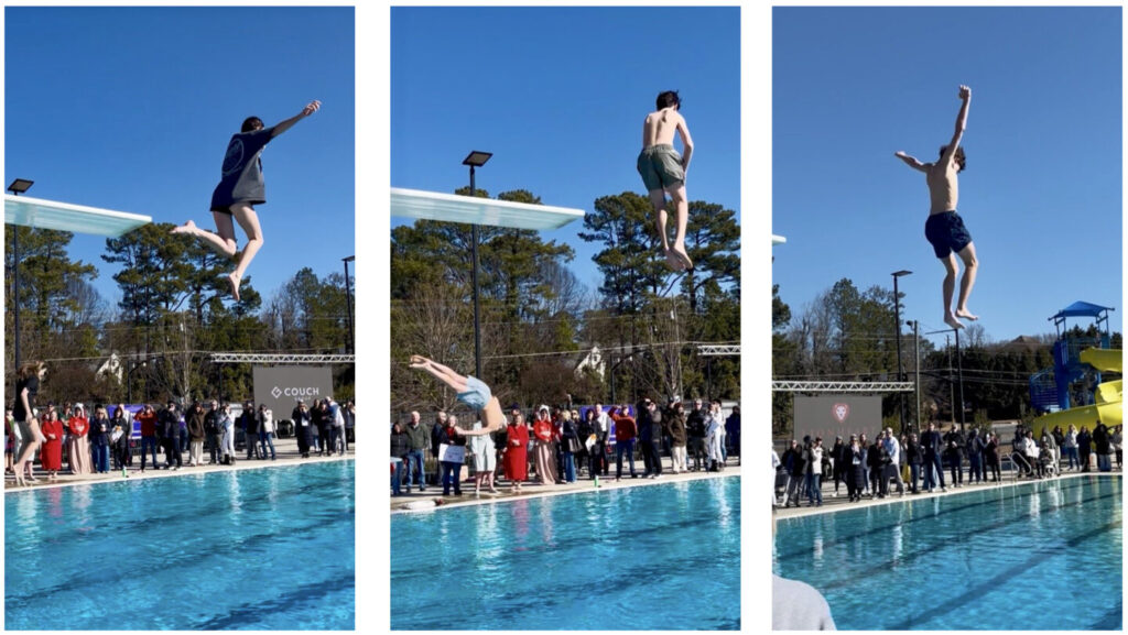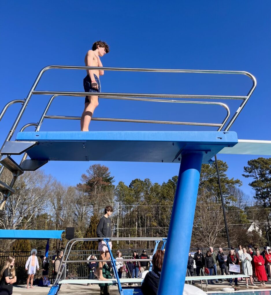 Up on the high dive, the anticipation was almost as intense as the cold water below. No backing out now—it was go time!